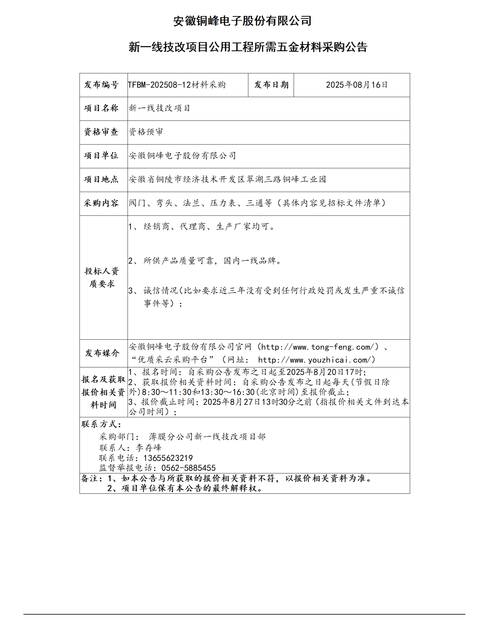 安徽銅峰電子股份有限公司 (新一線項目五金材料采購)_01