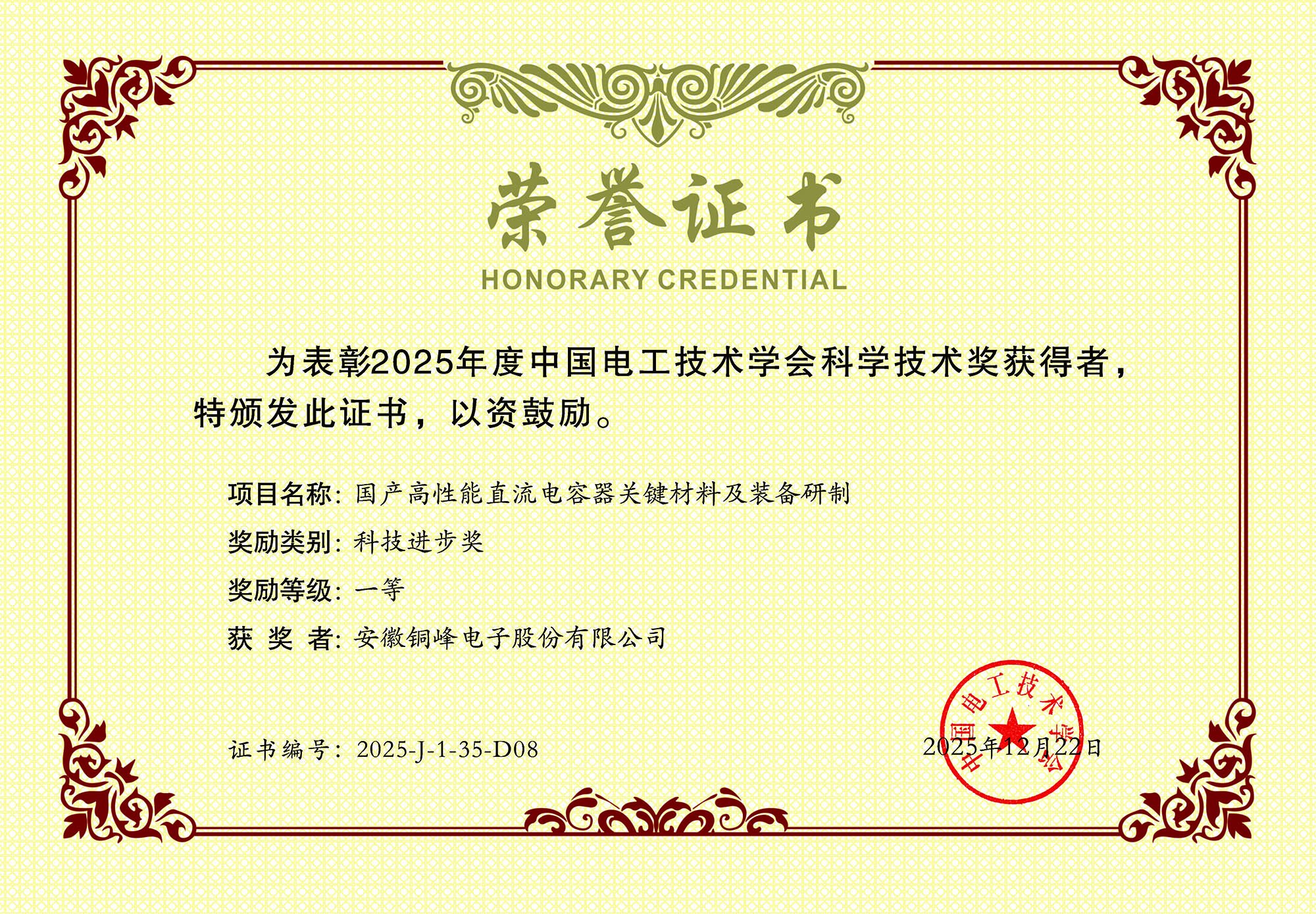 近日,公司參與的合作項(xiàng)目“國(guó)產(chǎn)高性能直流電容器關(guān)鍵材料及裝備研制”榮獲2025年度中國(guó)電工技術(shù)學(xué)會(huì)科技進(jìn)步一等獎(jiǎng)。