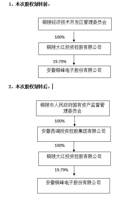 截止目前,公司控股股東大江投資持有公司股份111,705,979股,占公司總股本的19.79%。本次股權劃轉完成后,公司控股股東未發(fā)生變化,仍為大江投資。本次股權劃轉完成后,公司間接控股股東為西湖投資,實際控制人由將由銅陵經開區(qū)管委會變更為銅陵市人民政府國有資產監(jiān)督管理委員會。